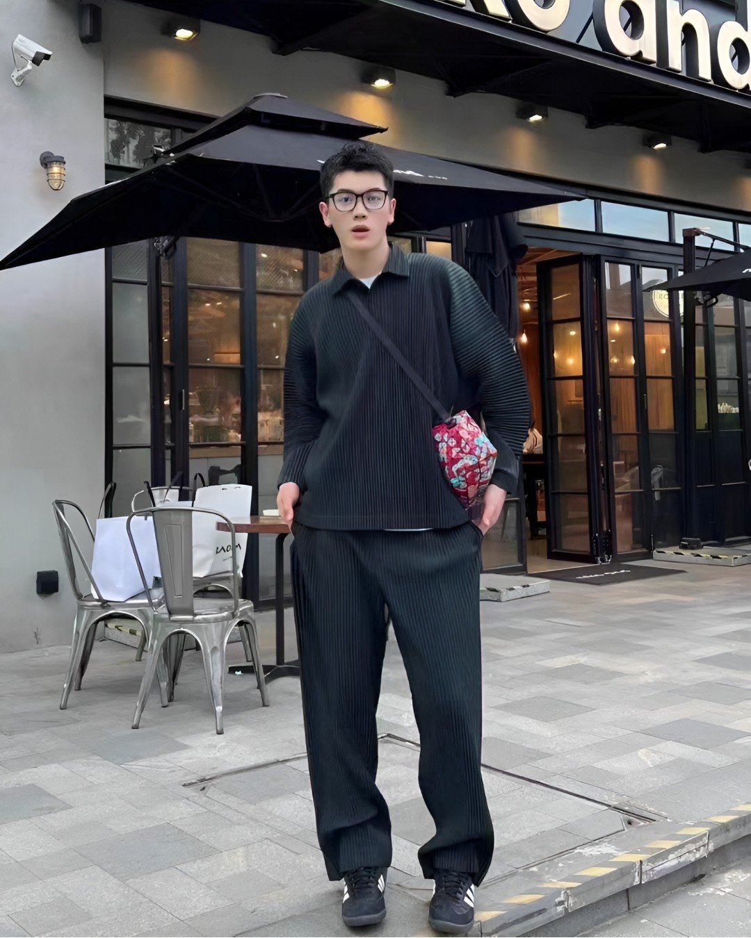 Men's Pleated Long Sleeve Polo Shirt Loose Retro Fashion Streetwear
